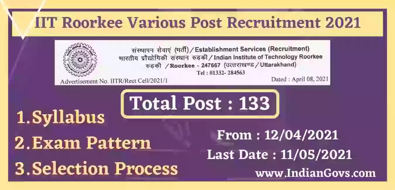 You will get exam pattern of IIT Roorkee Various Post Recruitment 2021. IIT Roorkee Various Post Recruitment exam pattern will help you a lot before going to real examination. We also provide detailed syllabus of IIT Roorkee Various Post Recruitment 2021. IIT Roorkee Various Post Recruitment Syllabus help you to make a good strategy to crack the exam.